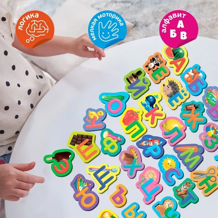Деревянная азбука на магнитах предназначена для изучения букв русского алфавита. Все элементы набора выполнены из безопасных материалов и окрашены в яркие цвета, которые обязательно привлекут внимание малыша. Изучая азбуку, ребёнок развивает логику, навык ассоциации и моторику рук.