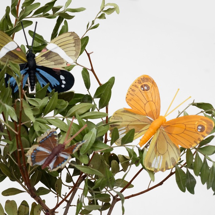 Назначение: декоративные бабочки с натуральными пёрышками, на клипсе-прищепке прекрасно подходят для украшения головных уборов, декора флористических композиций и топиариев, кукольной миниатюры, декора интерьера, украшения ландшафта и других творческих поделок.
