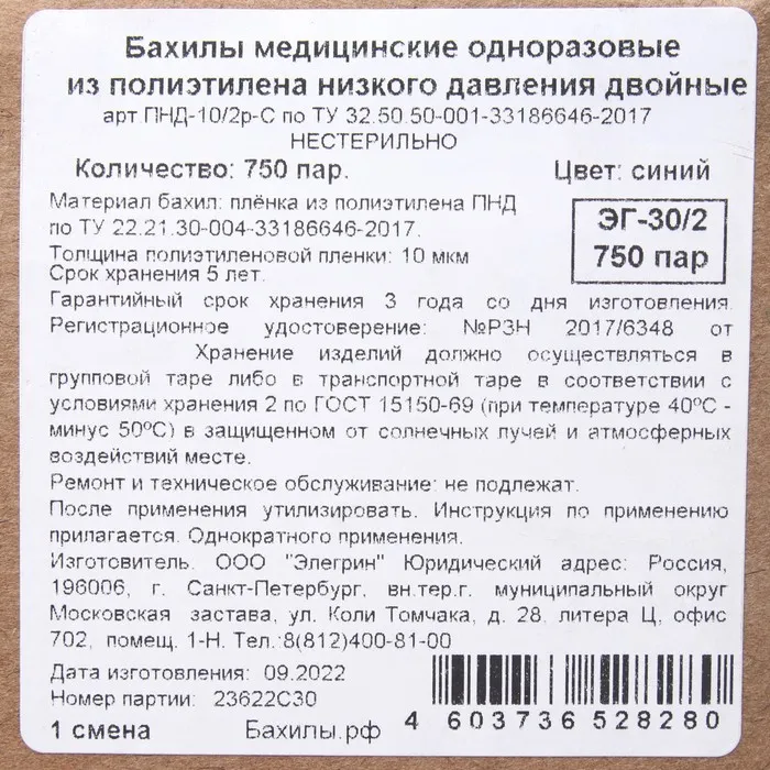 Бахилы медицинские Elegreen прочные с двойной резинкой , синие, одноразовые, нестерильные, изготовлены из высококачественного хлорполиэтилена или полиэтилена. Обладают высокой износоустойчивостью.