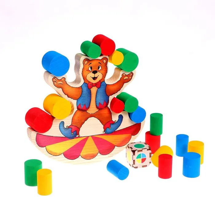 - Игра «Самый ловкий». Разделите поровну все цилиндры между игроками. Игроки по очереди бросают кубик и размещают на балансире цилиндр того цвета, который выпал на кубике. Задача игроков – как можно быстрее разместить все цилиндры на балансире. Игрок, уронивший цилиндр или медведя, считается проигравшим. Победителем считается игрок, благодаря которому медведь устоял.
