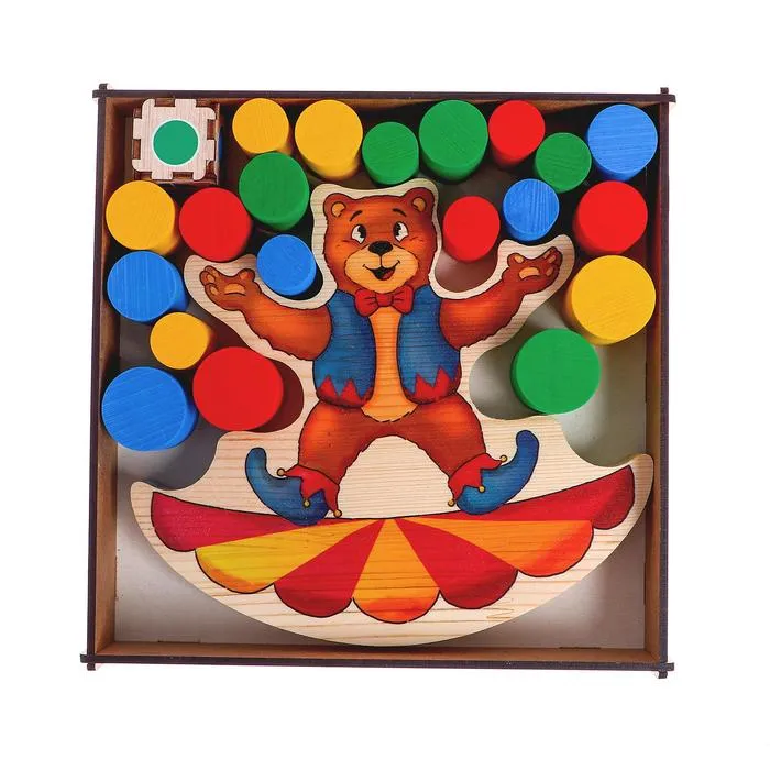- Игра «Балансирующий медведь». Предложите ребёнку разместить все цилиндры на балансире таким образом, чтобы медведь сохранил равновесие и не упал. Попросите ребёнка бросить кубик и определить, какого цвета цилиндр можно разместить на балансире: зеленый цвет на кубике – ребёнок размещает зеленый цилиндр; разноцветный круг на кубике – ребёнок размещает цилиндр любого цвета; неокрашенный круг на кубике – ребёнок пропускает ход. Как только медведь или один из цилиндров упадут, игра заканчивается. Играть можно одному, а также в компании родителей или друзей.