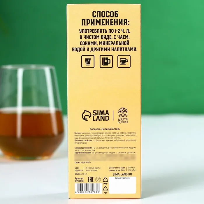 Состав: шиповник, черноплодная рябина, красный корень, зверобой, смородина, девясил, календула, золотой корень, ромашка, сахар-песок, вода очищенная, мёд натуральный, лимонная кислота.