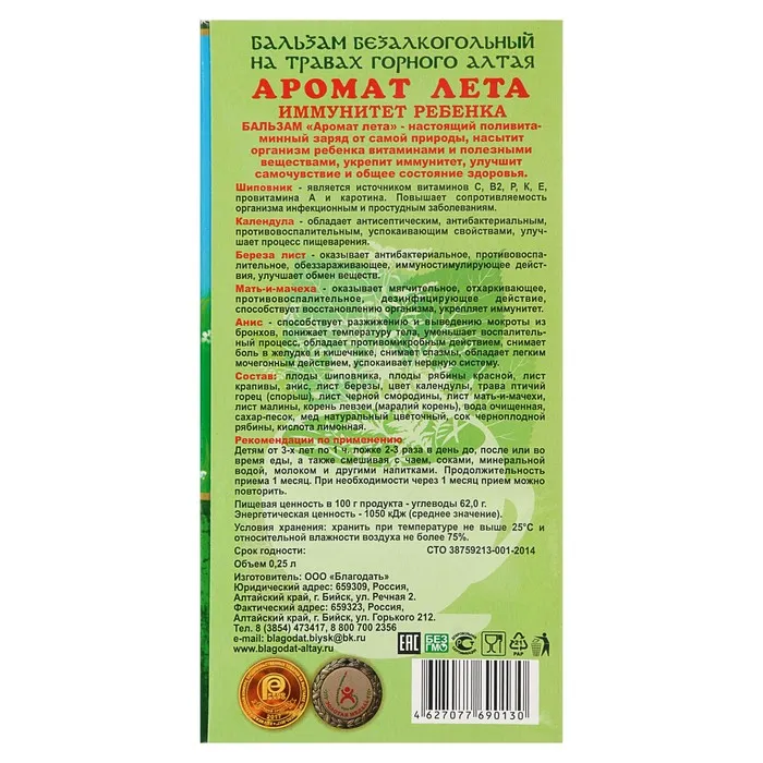 Бальзам «Аромат лета» — настоящий поливитаминный заряд от самой природы. Он насытит организм ребёнка витаминами и полезными веществами, укрепит иммунитет, улучшит самочувствие и общее состояние здоровья.