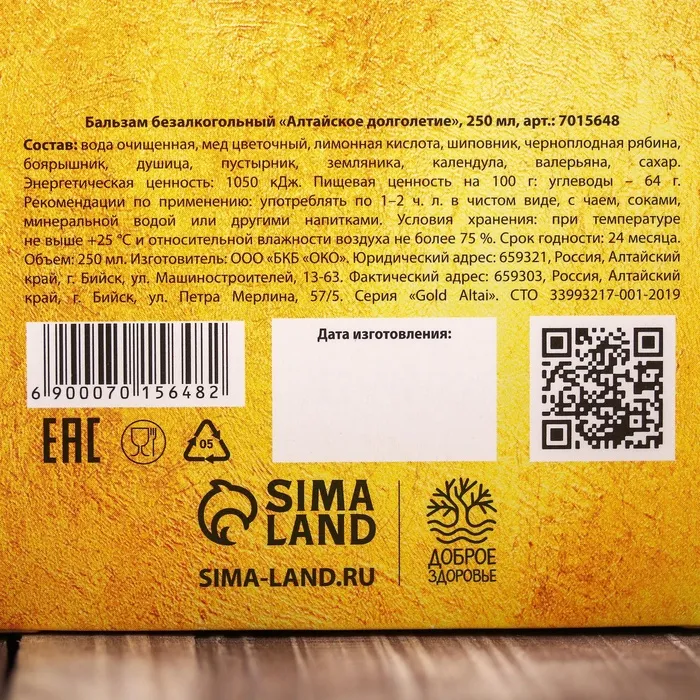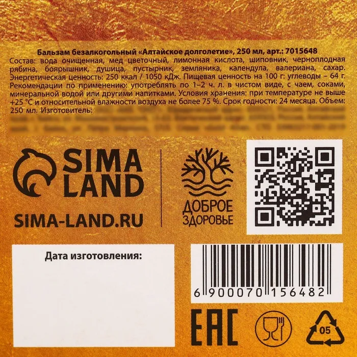 Бальзам безалкогольный на алтайских травах «Здоровый сон», 250 мл. — Характеристики