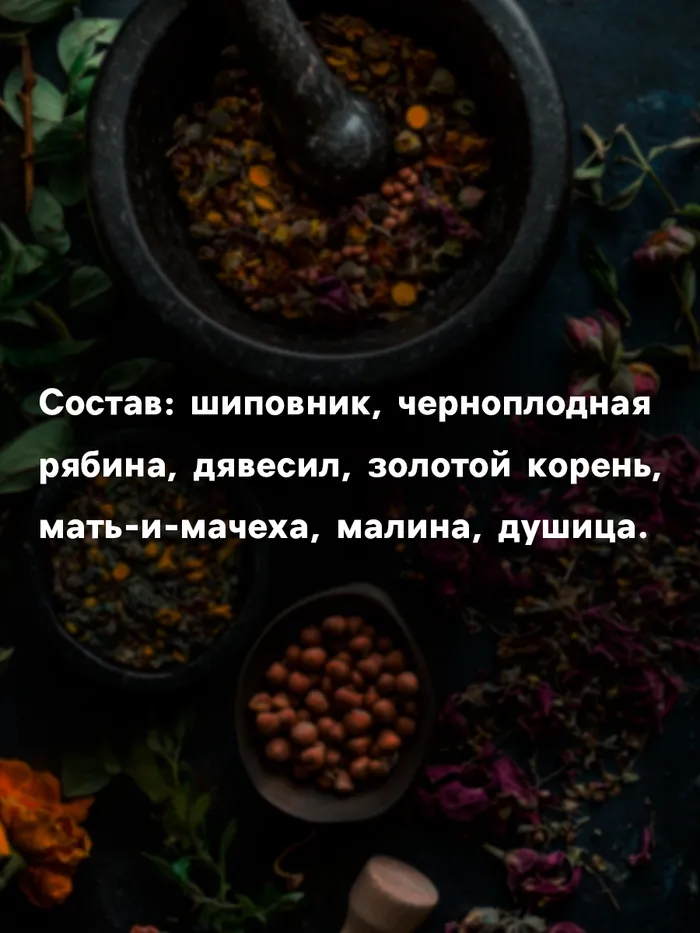 Состав: шиповник, черноплодная рябина, девясил, золотой корень, мать-и-мачеха, малина, душица, лимонная кислота, сахар.