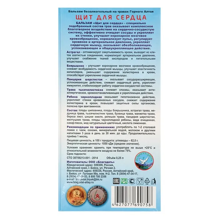 Бальзам безалкогольный "Щит для сердца", 250 мл — Характеристики