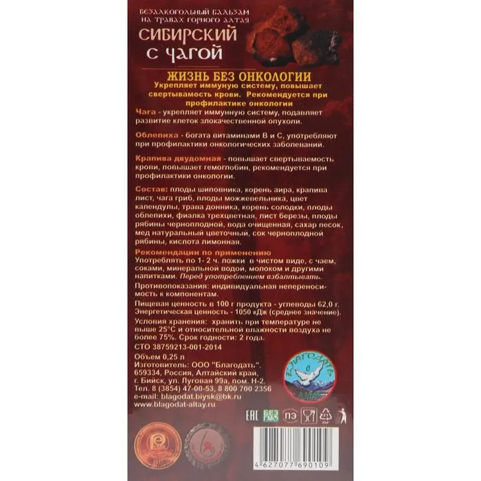 Состав: плоды шиповника, корень аира, крапивы лист, чаги гриб, плоды можжевельника, цветы календулы, трава донника, корень солодки, плоды облепихи, фиалка трёхцветная, лист берёзы, плоды рябины черноплодной, вода очищенная, сахар-песок, мёд натуральный, кислота лимонная, сок черноплодной рябины.