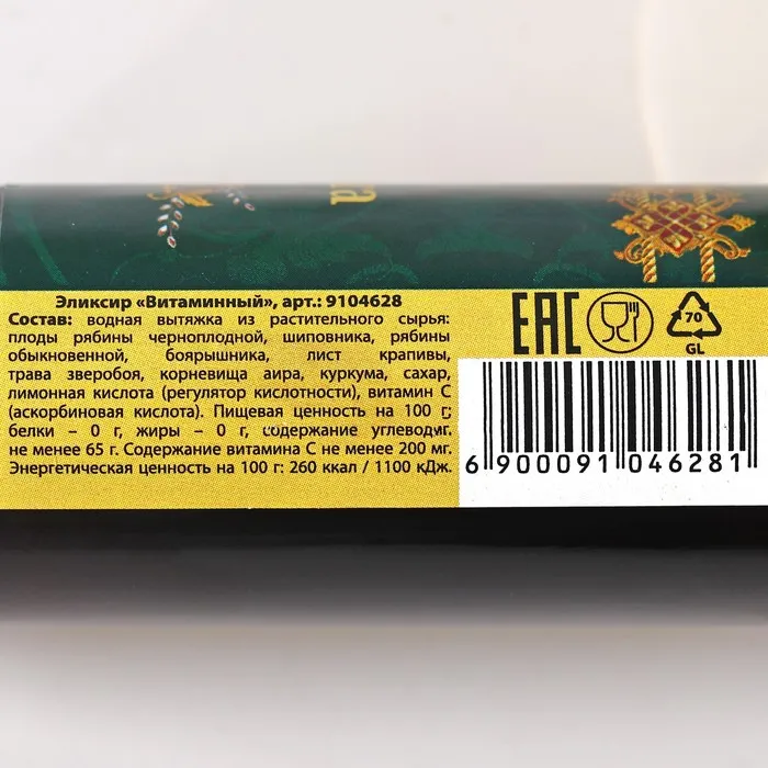 Состав: плоды рябины черноплодной, шиповника, рябины обыкновенной, боярышника, лист крапивы, трава зверобоя, корневища аира, куркума, сахар, лимонная кислота, витамин С.