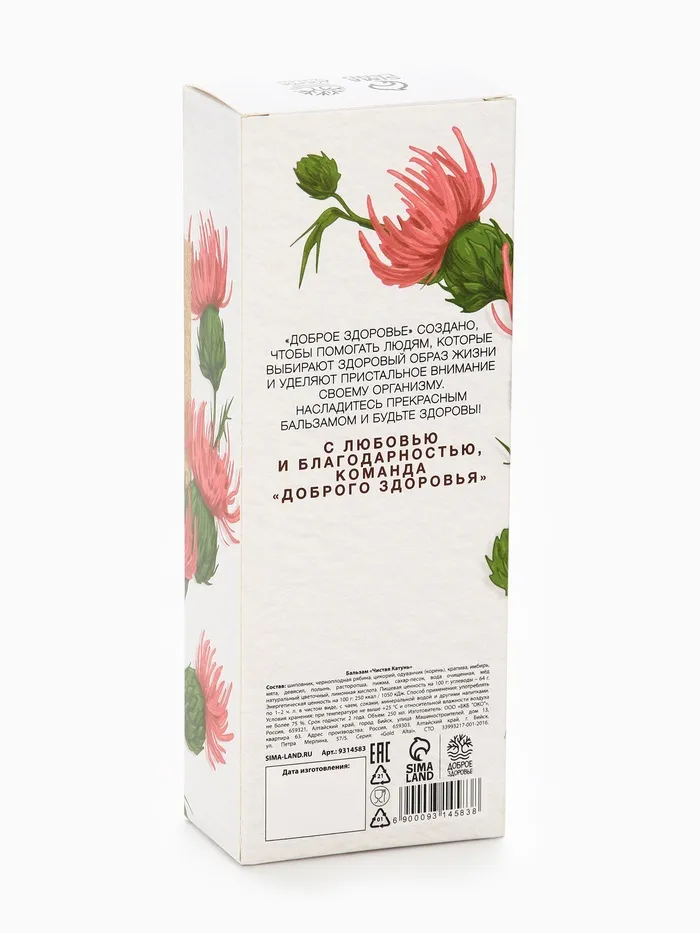 Состав: шиповник, черноплодная рябина, цикорий, одуванчик (корень), крапива, имбирь, мята, девясил, полынь, расторопша, пижма, сахар-песок, вода очищенная, мёд натуральный цветочный, лимонная кислота.