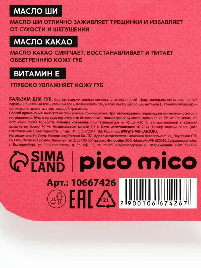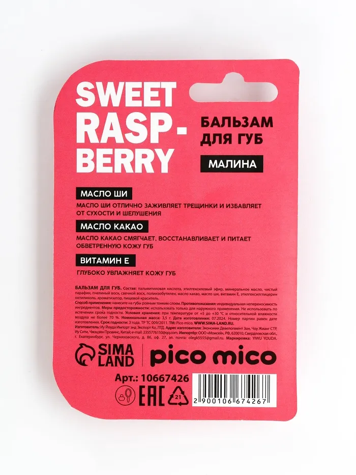Бальзам для губ питание и увлажнение, с ароматом малины, PICO MICO, 3.5 г — Характеристики