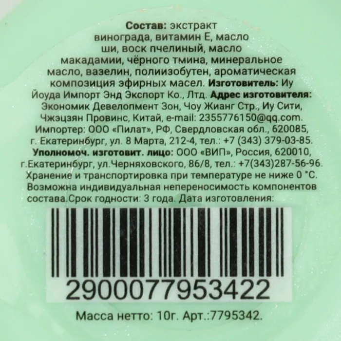 Состав: экстракт винограда, витамин Е, масло ши, воск пчелиный, масло макадамии, масло черного тмина, минеральное масло, вазелин, полиизобутен, ароматическая композиция эфирных масел.