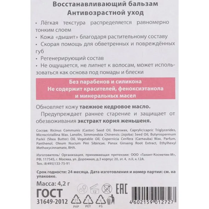 Бальзам для губ БиСи "восстанавливающий" содержит настоящее кедровое масло и экстракт женьшеня, помогающие глубоко ухаживаь за губами. Улучшает регенерацию кожи губ, благодаря чему поврежденная кожа лучше восстанавливается. Препятствует преждевременному старению, разглаживает микрорельеф кожи губ, противостоит потере влаги, помогает бороться с простудой на губах. После регулярного применения кожа губ становится мягкой, привлекательнои и ухоженной.