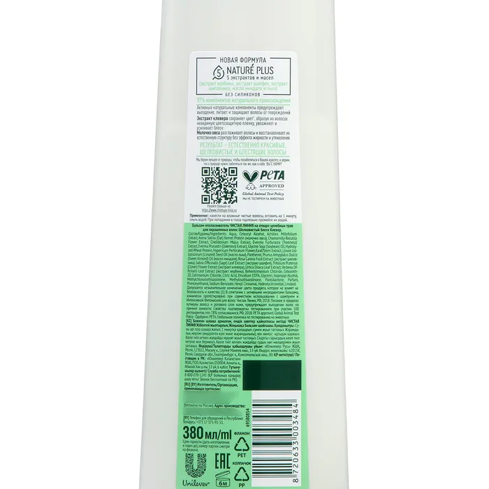 Состав: Aqua, Cetearyl Alcohol, Achillea Millefolium Extract, Avena Sativa (Oat) Kernel Protein (молочко овса), Chamomilla Recutita Flower Extract, Chelidonium Majus Extract, Evernia Furfuracea (Treemoss) Extract, Evernia Prunastri (Oakmoss) Extract, Glycine Soja (Soybean) Oil, Hydrolyzed Wheat Protein, Hypericum Perforatum Flower/Leaf/Stem Extract, Linum Usitatissimum (Linseed) Seed Oil (масло льна), Panthenol, Prunus Amygdalus Dulcis (Sweet Almond) Oil (масло миндаля), Rosa Canina Fruit Extract (экстракт шиповника), Salvia Officinalis (Sage) Leaf Extract (экстракт шалфея), Trifolium Pratense (Clover) Flower Extract (экстракт клевера), Urtica Dioica Leaf Extract, Verbena Officinalis Leaf Extract (экстракт вербены), Behentrimonium Chloride, Ceteareth-20, Cetrimonium Chloride, Citric Acid, Disodium EDTA, Glycerin, Isopropyl Alcohol, Methylchloroisothiazolinone, Methylisothiazolinone, Pantolactone, Parfum, Phenoxyethanol, Sodium Benzoate, Hexyl Cinnamal, Hydroxycitronellal, Linalool.
