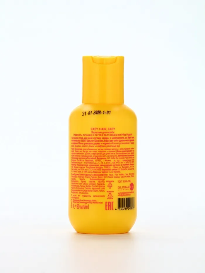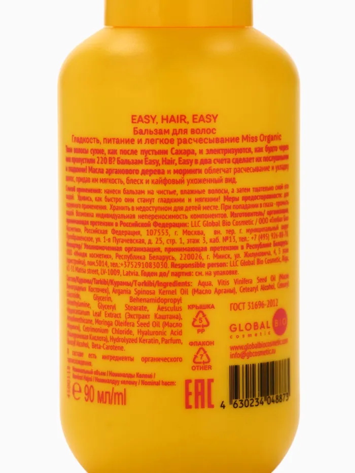 Состав: Aqua, Vitis Vinifera Seed Oil (Масло Виноградных Косточек), Argania Spinosa Kernel Oil (Масло Арганы), Cetearyl Alcohol, Cetearyl Glucoside, Glycerin, Behenamidopropyl Dimethylamine, Glyceryl Stearate, Аesculus Hippocastanum Leaf Extract (Экстракт Каштана), Amodimethicone, Moringa Oleifera Seed Oil (Масло Моринги), Cetrimonium Chloride, Hyaluronic Acid (Гиалуроновая Кислота), Hydrolyzed Keratin, Parfum, Benzyl Alcohol, Beta-Karotene.