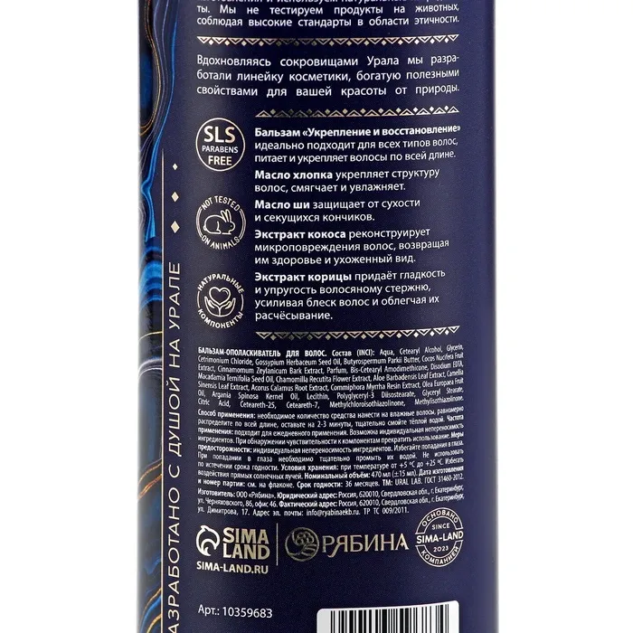 Бальзам для волос, комплекс масел и экстрактов, укрепление и восстановление, 470 мл, URAL LAB — Характеристики