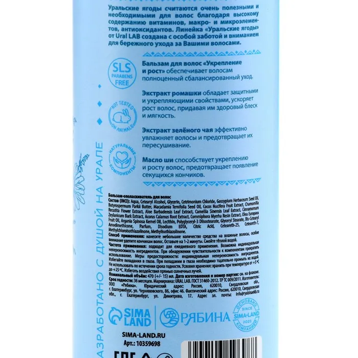 Бальзам для волос с экстрактом ромашки, зелёного чая и маслом ши, укрепление и рост, 470 мл, URAL LAB — Характеристики