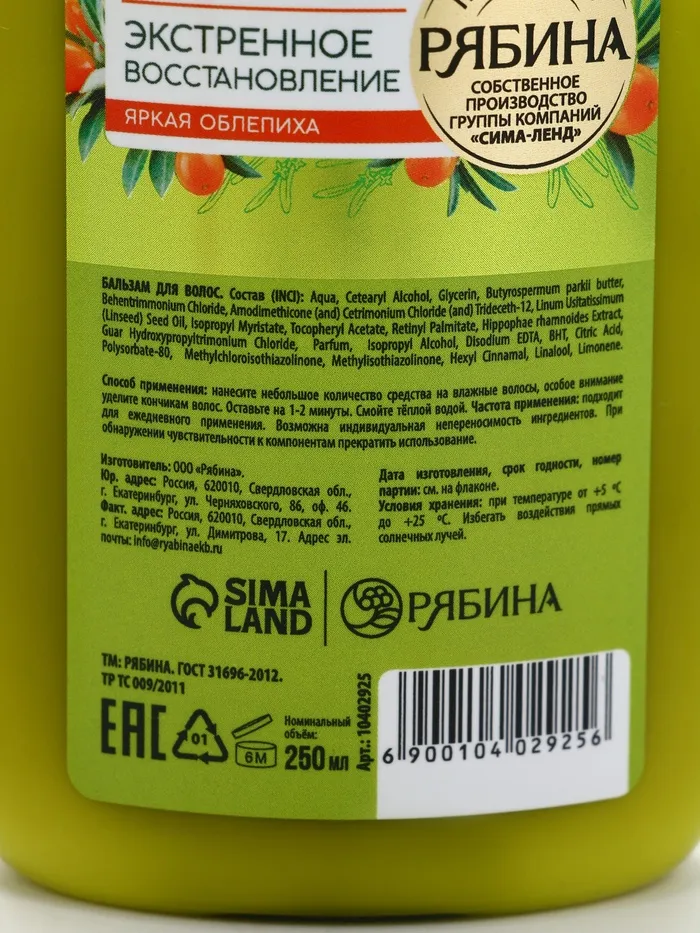 Бальзам для волос с натуральным экстрактом облепихи, экстренное восстановление, 250 мл — Характеристики