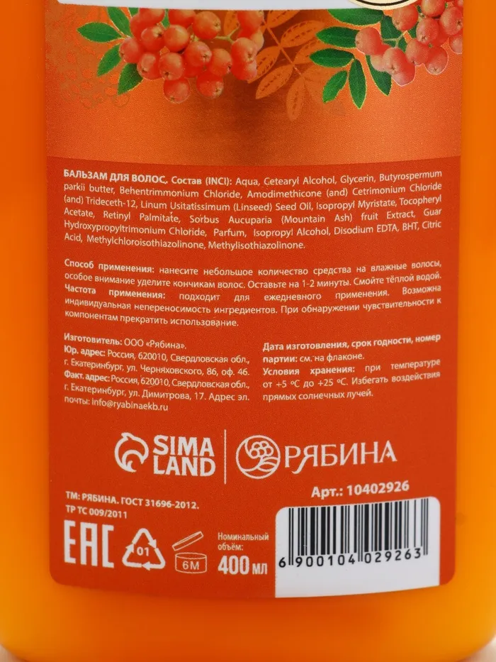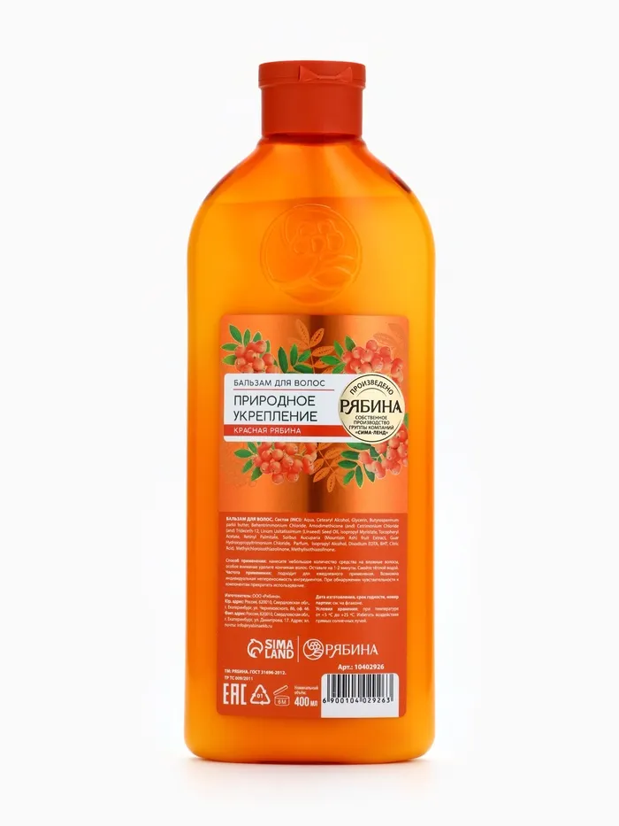 Бальзам для волос с натуральным экстрактом рябины, природное укрепление, 400 мл — Характеристики