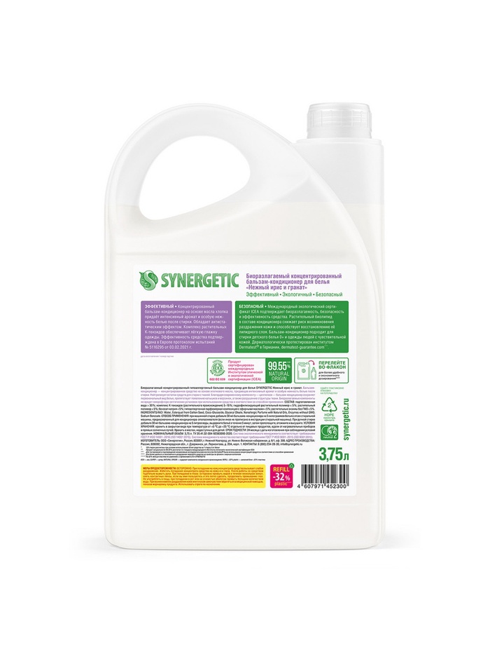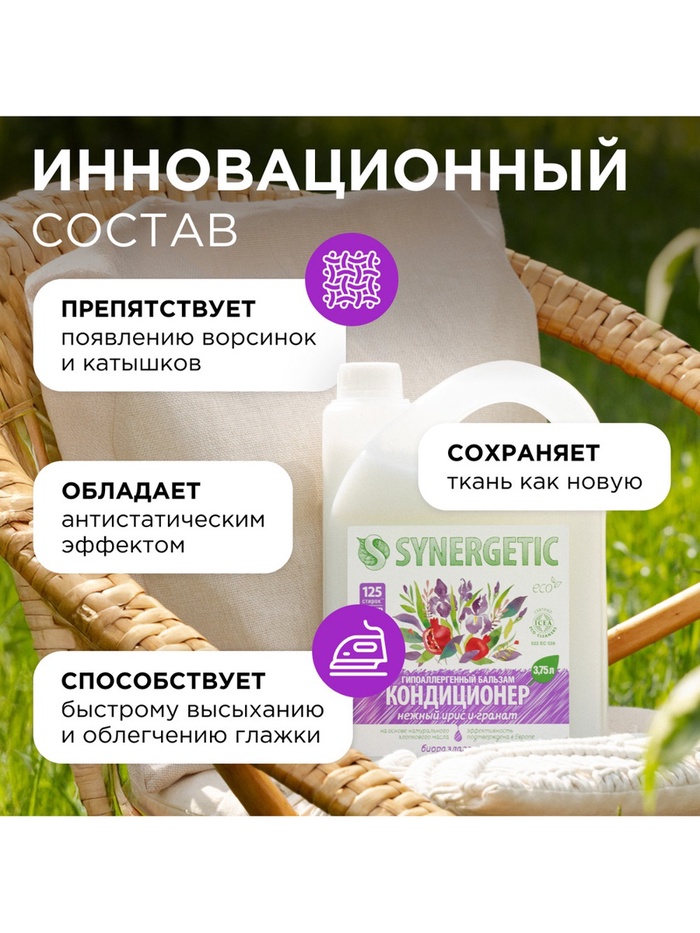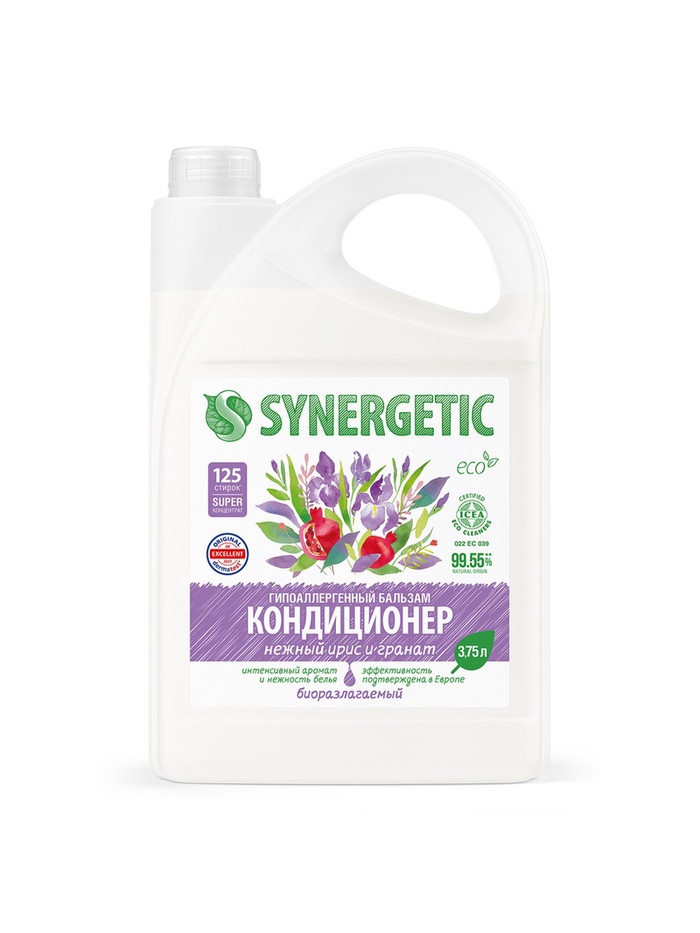 Биоразлагаемый концентрированный гипоаллергенный бальзам-кондиционер для белья SYNERGETIC с нежным ароматом "Нежный ирис и гранат" на основе масла хлопка придает белью мягкость и способствует его быстрому высыханию после стирки. Средство нейтрализует остатки средств для стирки на ткани, помогает сохранить структуру ткани, защищая волокна от изнашивания и повреждения.