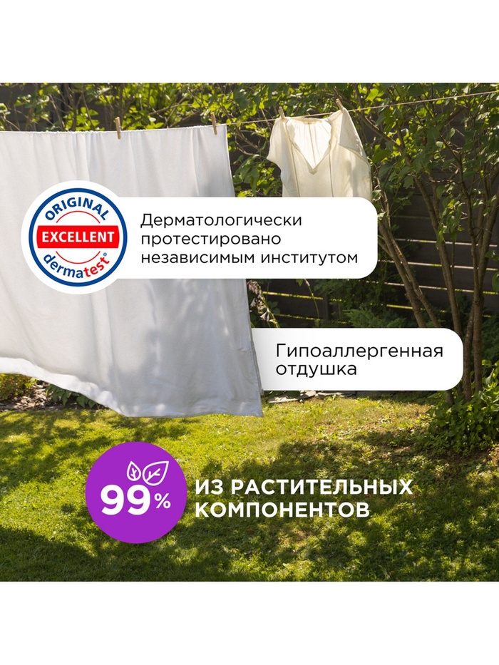 Растительный биолипид в составе кондиционера снижает риск возникновения раздражения кожи и способствует восстановлению ее липидного слоя. Бальзам-кондиционер подходит для стирки детского белья 0+ и одежды людей с чувствительной кожей.