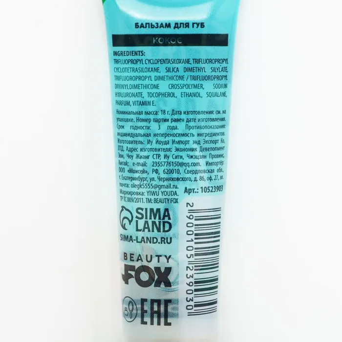 Бальзам-масло для губ с витамином Е, 18 мл, аромат кокоса, BEAUTY FOOD — Характеристики