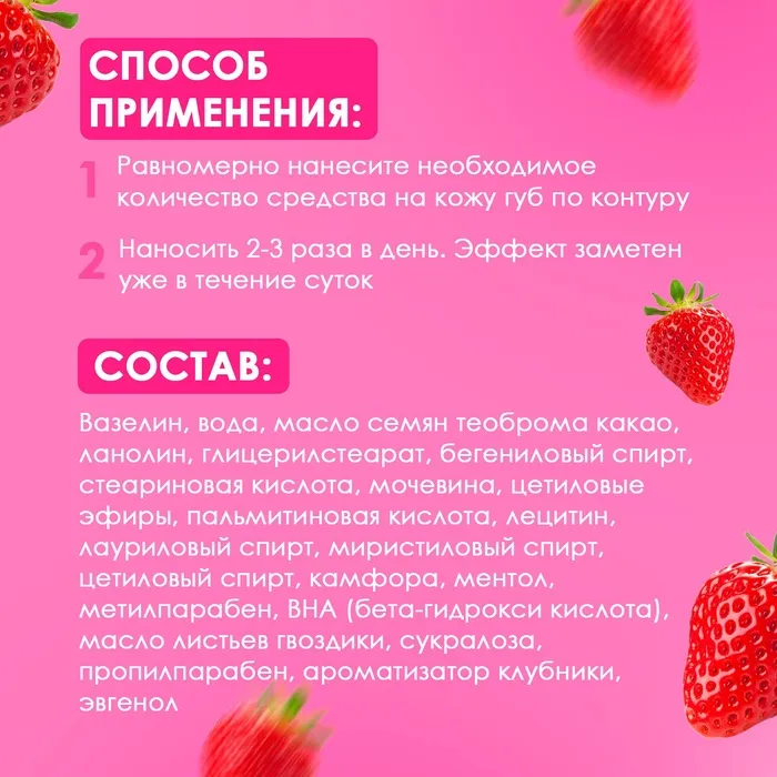 Состав: вазелин, вода, масло семян теоброма какао, ланолин, глицерилстеарат, бегениловый спирт, стеариновая кислота, мочевина, цетиловые эфиры, пальмитиновая кислота, лецитин, лауриловый спирт, миристиловый спирт, цетиловый спирт, камфора, ментол, метилпарабен, BHA (бета-гидрокси кислота), масло листьев гвоздики, сукралоза, пропилпарабен, ароматизатор клубники, эвгенол.