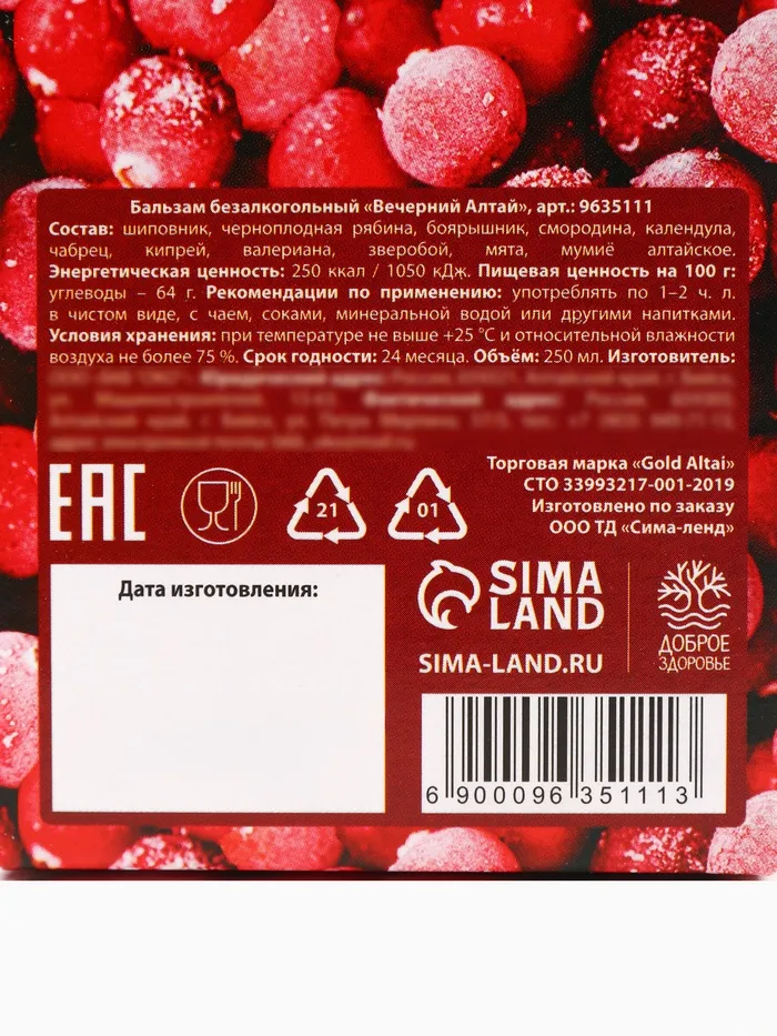 Бальзам «Силы духа» общеукрепляющий, на алтайских травах: шиповник, черноплодная рябина, боярышник, смородина, календула, чабрец, кипрей, валериана, мумиё, 250 мл. — Характеристики