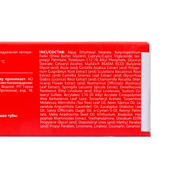 INCI/Состав: Aqua, Ethylhexyl Stearate, Butyrospermum Parkii (Shea) Butter, Glycerin, Caprylic/Сapric Triglyceride, Isopropyl Palmitate, Potassium C12-16 Alkyl Phosphate, Glyceryl Stearate, Cetearyl Alcohol, MultiEx® BSASM (ECO) (Butylene Glycol (and) Aqua (and) Centella Asiatica Extract (and) Polygonum Cuspidatun Root Extract (and) Scutellaria Baicalensis Root Extract (and) Camellia Sinensis Leaf Extract (and) Glycyrrhiza Glabra (Licorice) Root Extract (and) Chamomilla Recutita (Matricaria) Flower Extract (and) Rosmarinus Officinalis (Rosmary) Leaf Extract), Spongilla Lacustris Spicule Extract, Dimethicone, Panthenol, Ethyl Linoleate (and) Ethyl Linolenate, Sodium Cetearyl Sulfate, Acrylates/ C10-30 Alkyl Acrylate Crosspolymer, Aloe Barbadensis Leaf Juice, Tocopheryl Acetate, Turpentine, Melaleuca Alternifolia (Tea Tree) Leaf Oil, Abies Sibirica Oil, Lavandula Angustifolia (Lavender) Oil, Eucalyptus Globulus Leaf Oil, Salvia Officinalis (Sage) Oil, o-Cymen-5-Ol, Retinyl Palmitate, Melia Azadirachta Seed Oil, Ichthyolum, Bisabolol, Hippophae Rhamnoides Extract, Triethanolamine, Disodium EDTA, Propylene Glycol (and) Diazolidinyl Urea (and) Methyl Paraben (and) Propyl Paraben, Limonene, Linalool, Coumarin, Geraniol.