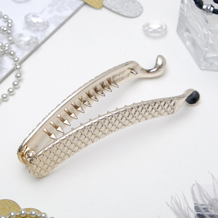 Элегантный штрих к вашему повседневному образу! Золотистая заколка-банан для волос – изысканный аксессуар, который добавит шарма и стиля в ваш гардероб. Этот аксессуар сочетает в себе утонченную классическую эстетику и удобство в использовании, подходя для любой модницы.