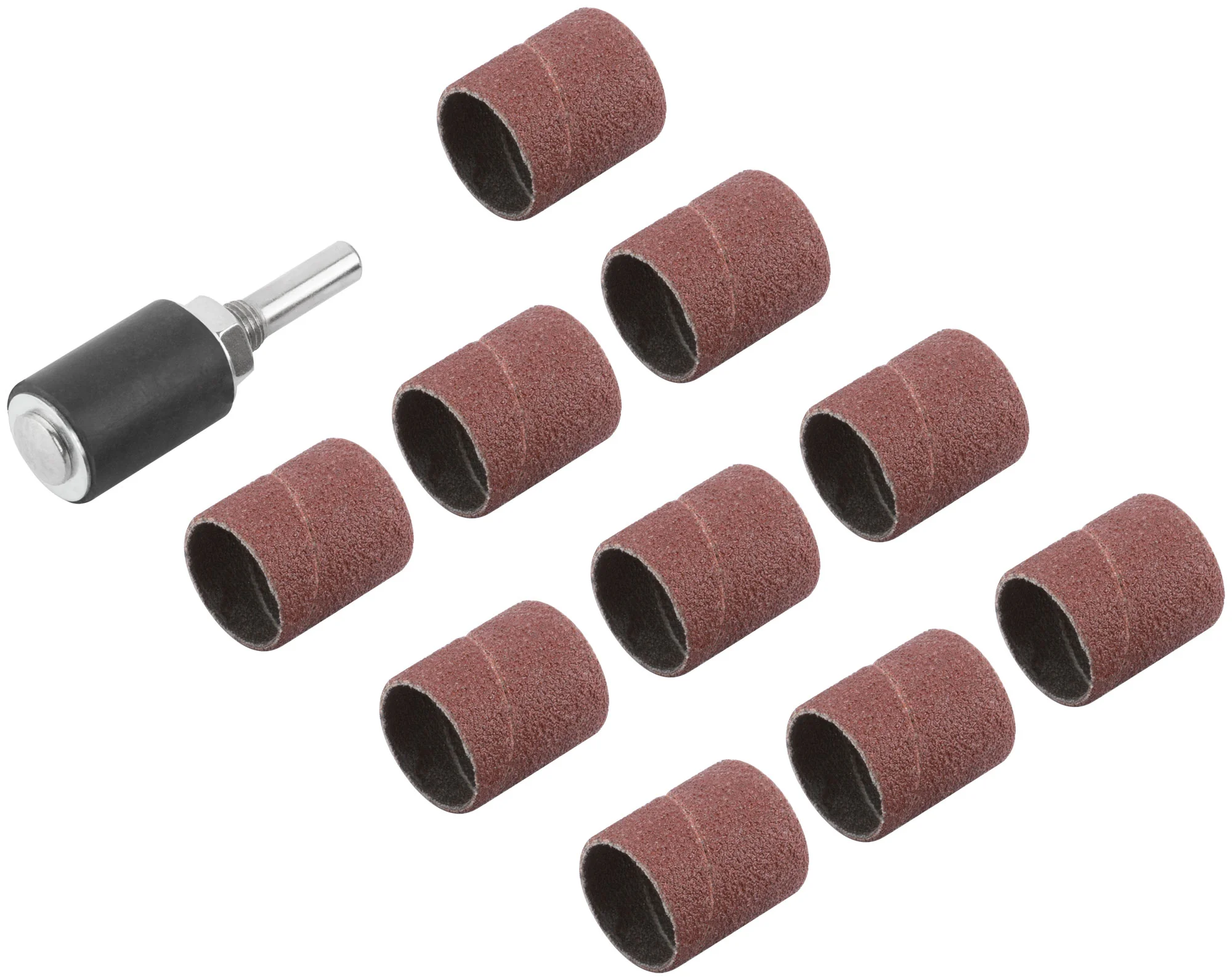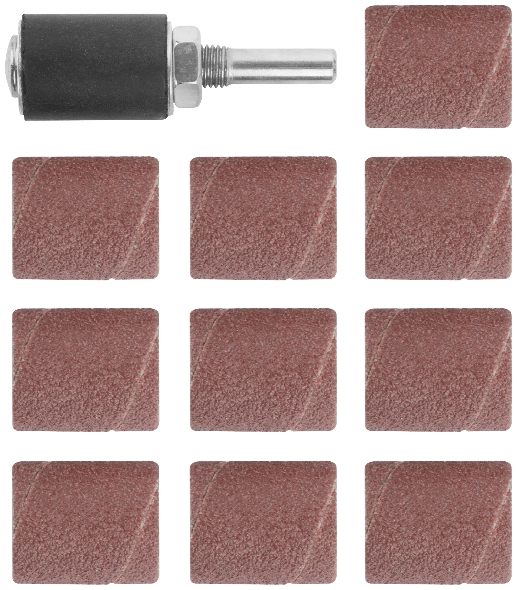 В комплекте представлены бандажи с зернистостью 80 и 120, что делает их подходящими для разных этапов шлифовки. Все элементы набора изготовлены с использованием тканевой основы и алюминий-оксидного абразива, что гарантирует долгий срок службы и эффективность работы. Хвостовик из инструментальной стали диаметром 6,35 мм делает их совместимыми с большинством электродрелей и шлифмашин.