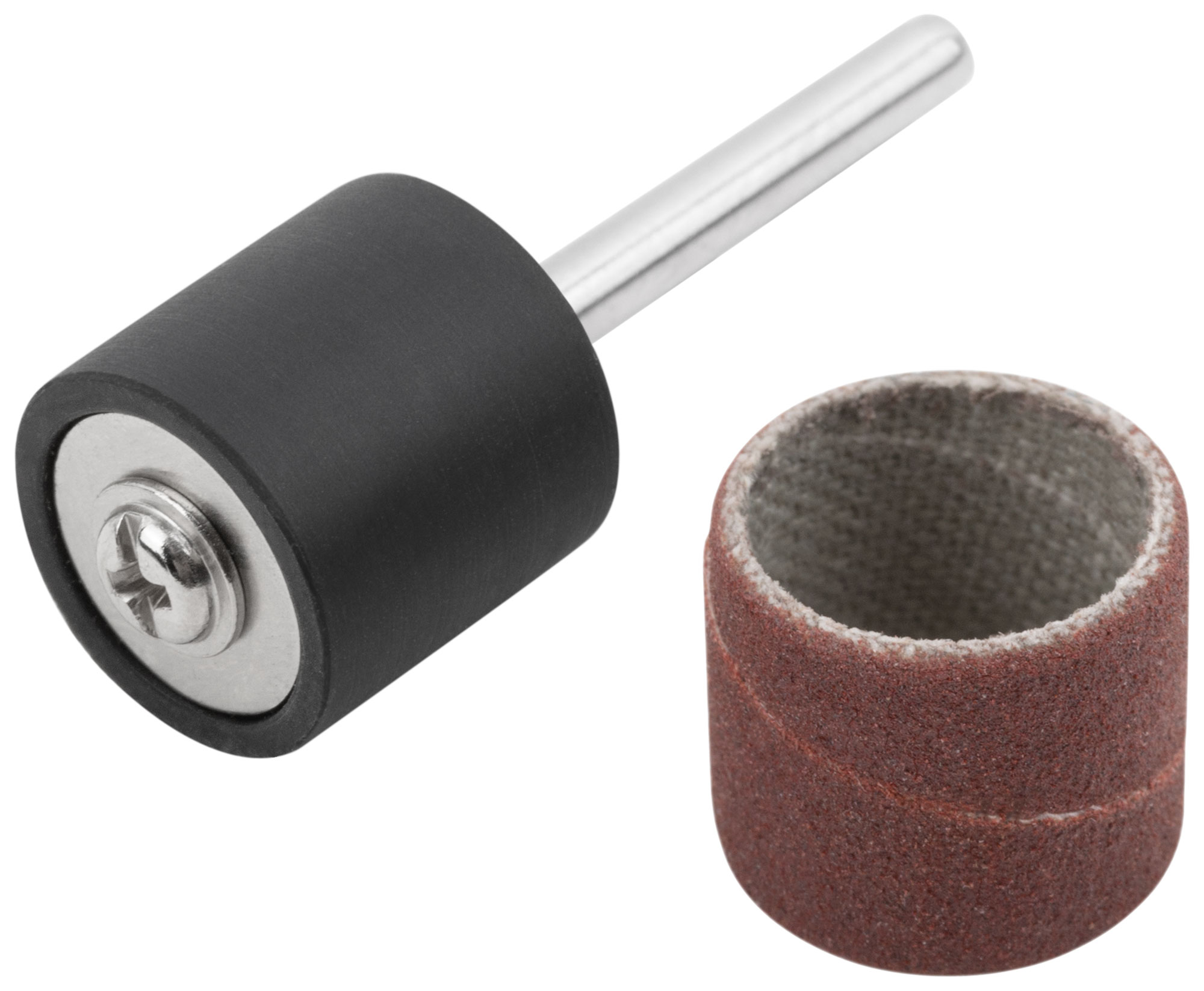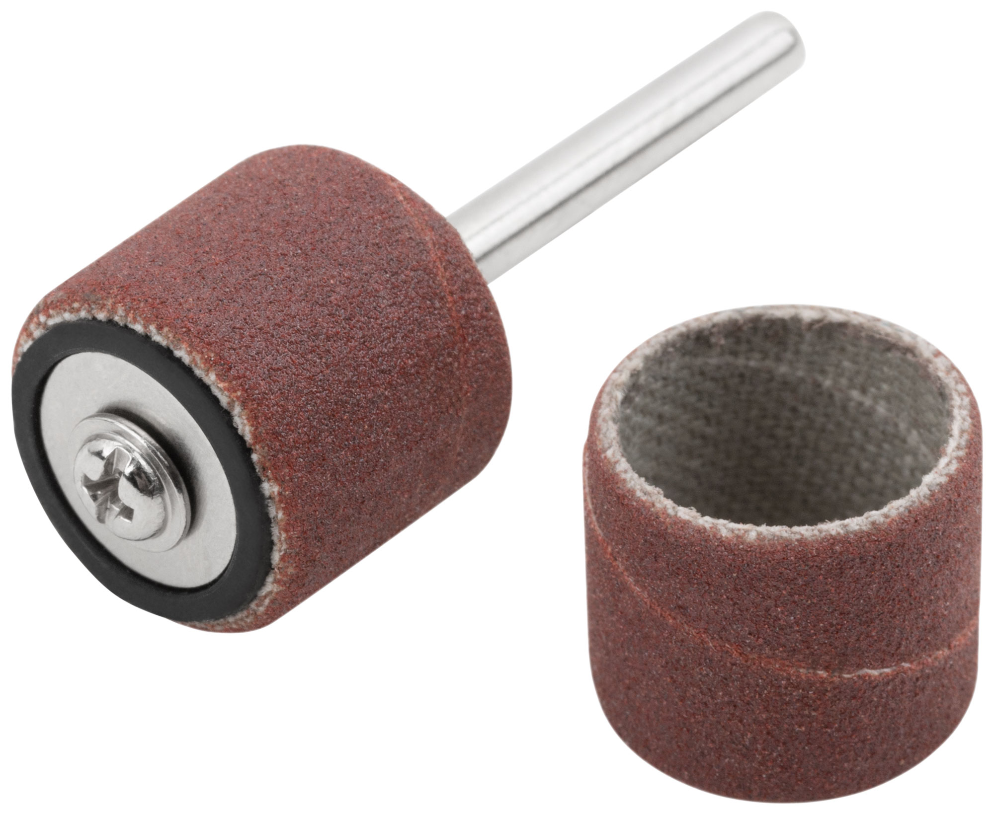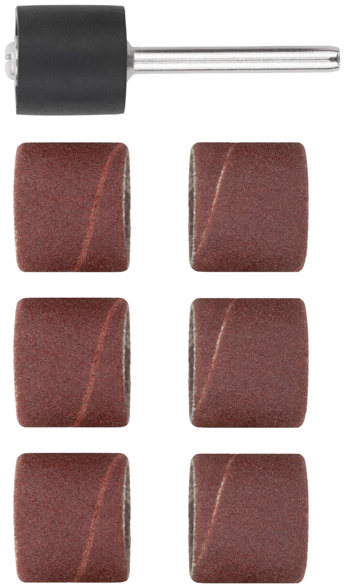 Набор включает 6 бандажей с зернистостью 80 и один штифт. Эти аксессуары изготовлены на тканевой основе с применением алюминий-оксидного абразива, что обеспечивает высокую износостойкость и долговечность. Хвостовик выполнен из инструментальной стали для надежного крепления.
