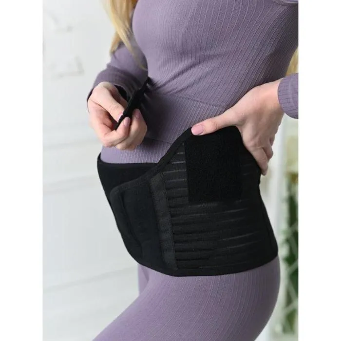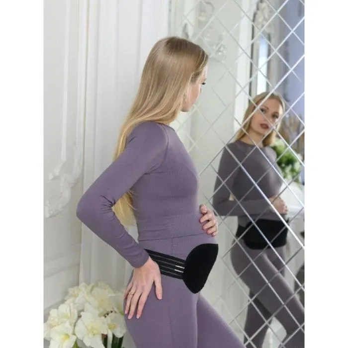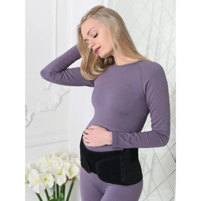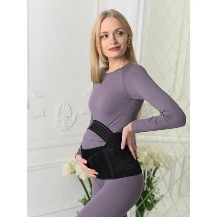 Пояс для беременных женщин (универсальный) состоит из трех частей. Во время беременности нижнюю переднюю деталь пояса надевают широкой стороной под живот, фиксируют сбоку на липучку-микропласт. Самую широкую часть пояса расположить в области поясницы и закрепить к нижней передней части по бокам. Узкую короткую деталь зафиксировать сверху, над животом. С помощью боковых липучек она позволяет надежно зафиксировать конструкцию, а также регулировать размер и посадку бандажа по форме животика. После родов изделие разворачивается и надевается широкой частью на живот и с помощью узкой детали регулируется степень фиксации пояса.