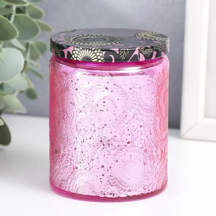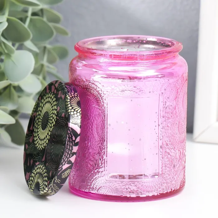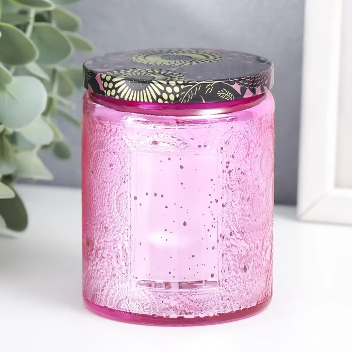 Банка для свечей стекло с крышкой "Цветочная" розовая, цилиндр, гальваника 9х7х7 см