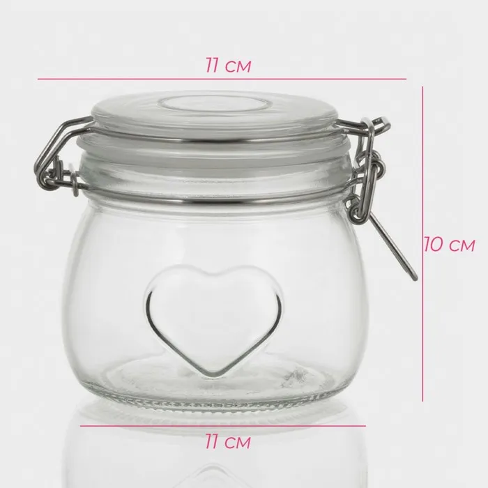 Банка для сыпучих Доляна «Сердце», 580 мл, 10.5×10 см, с бугельным замком, стекло, прозрачная — Характеристики
