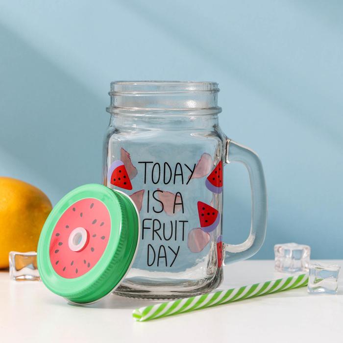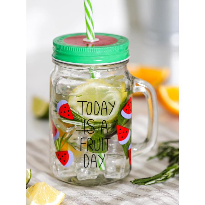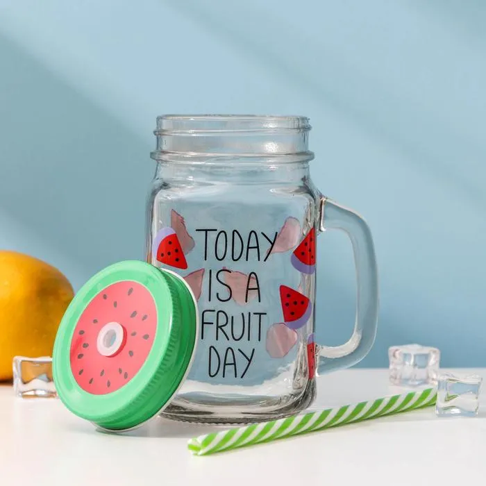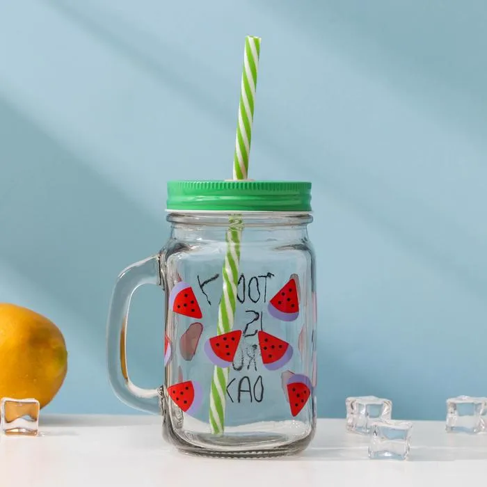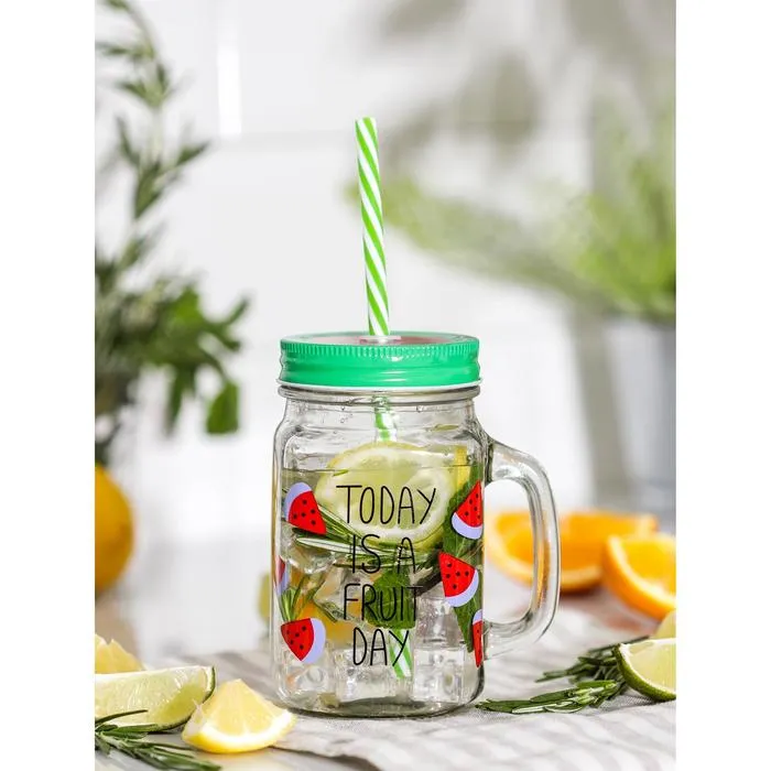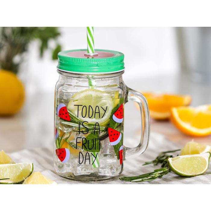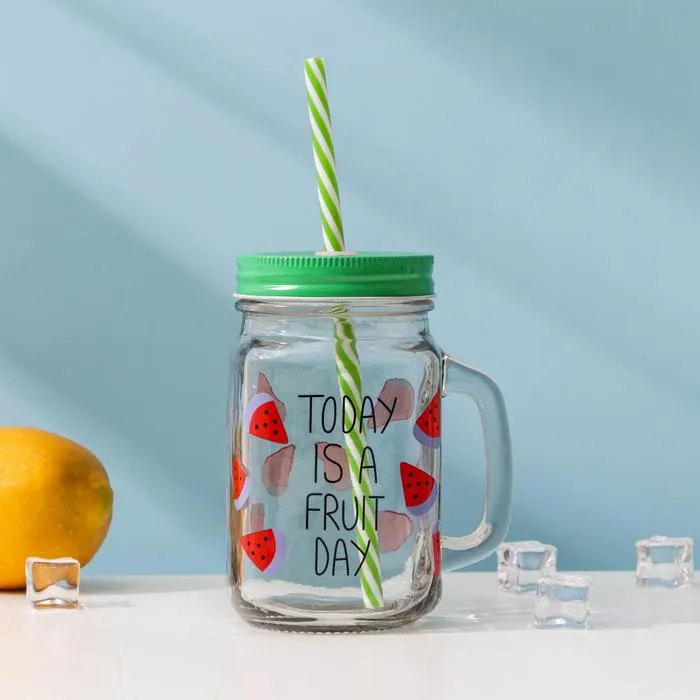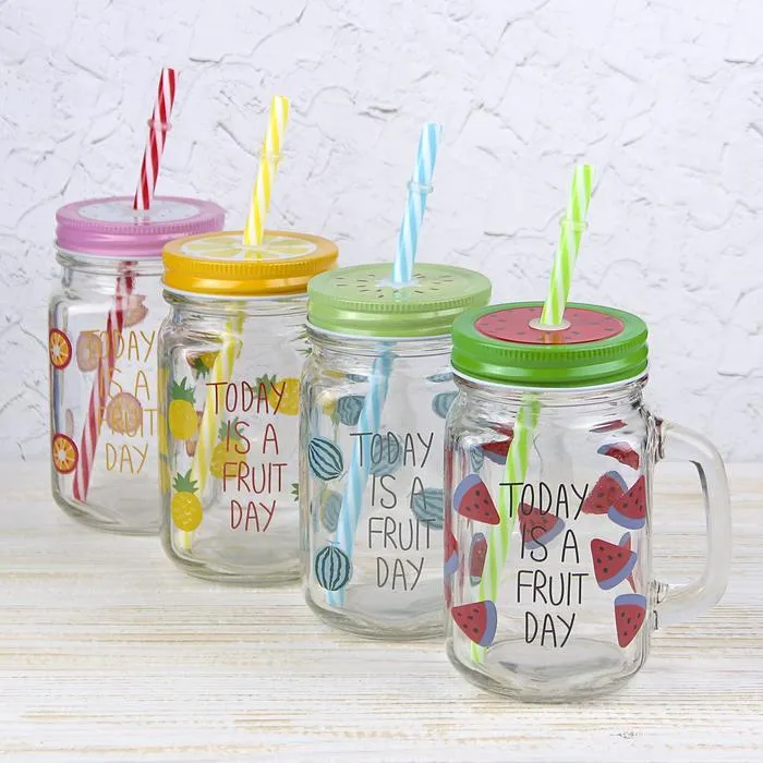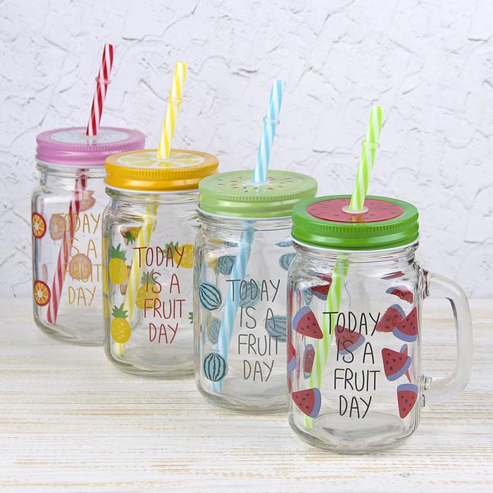 Банка с крышкой и трубочкой Доляна «Счастливый день», 450 мл, 10.5×7.5×13 см, стекло, МИКС — Характеристики