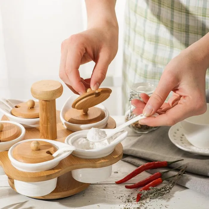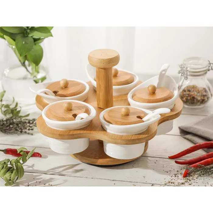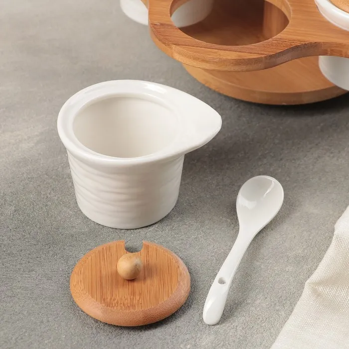 Банки для хранения сыпучих с ложками на деревянной подставке «Эстет», 5 предметов: 100 мл, 7.7×7 см, керамические, белые — Характеристики