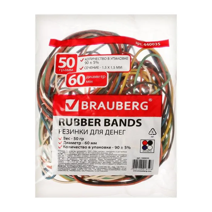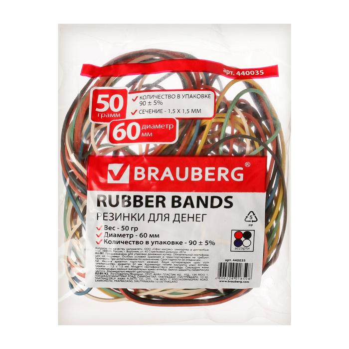 Банковская резинка, 50 г, BRAUBERG, диаметр 60 мм, 90 шт., ± 5%, натуральный каучук, МИКС, в пакете — Характеристики