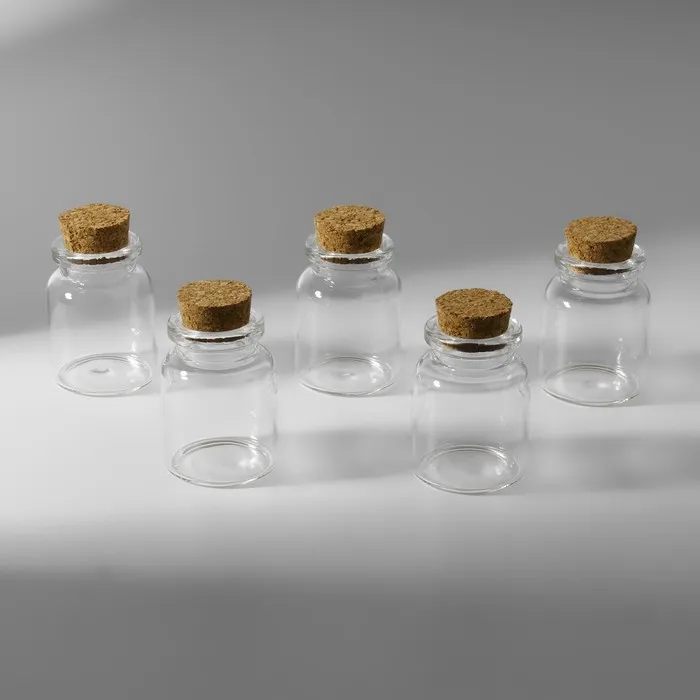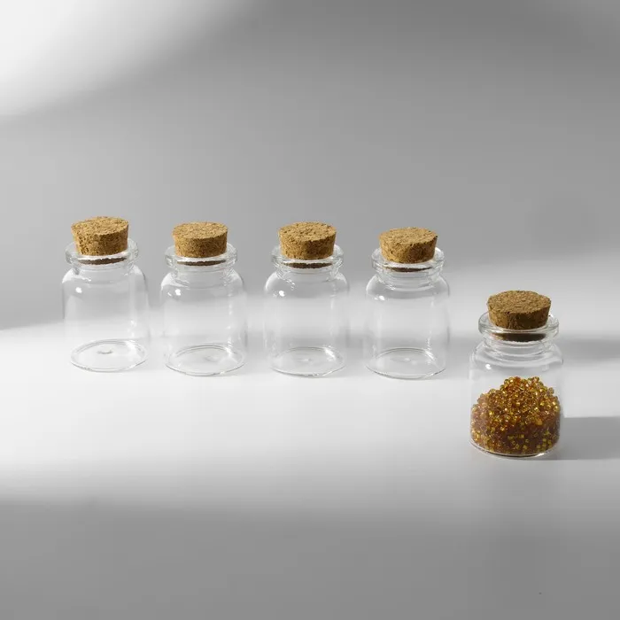 Каждая баночка имеет размеры 3×4.5 см, что делает их компактными и удобными для хранения. Прозрачный стеклянный корпус позволяет легко видеть содержимое, а пробковая крышка надежно защищает ваши материалы от пыли и повреждений.