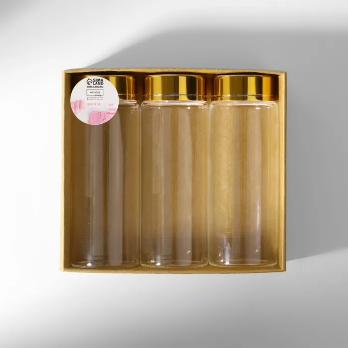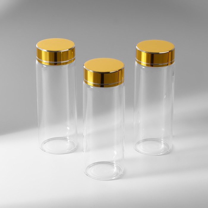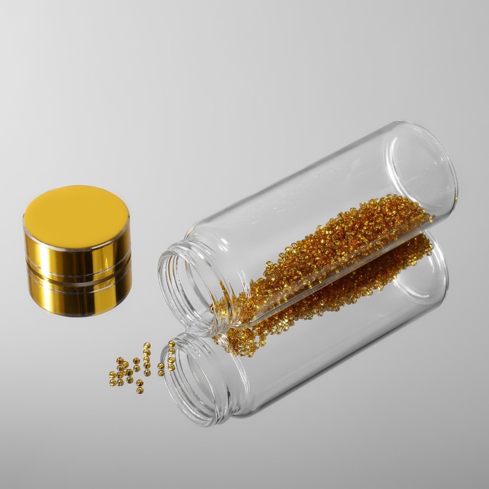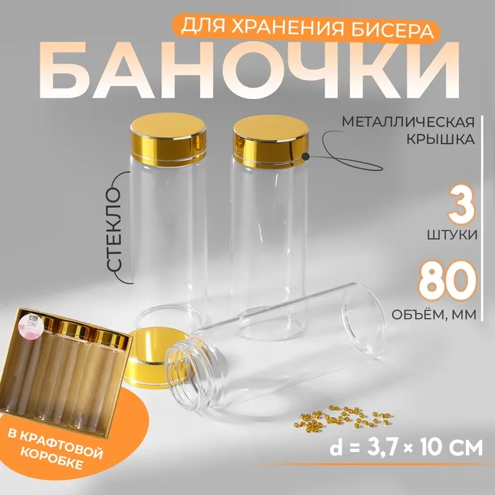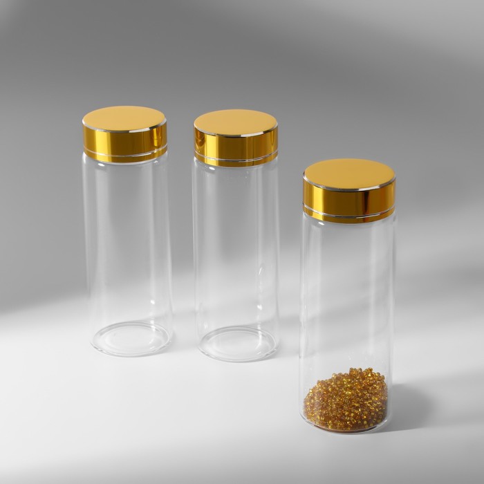 Каждая баночка выполнена из прочного стекла с золотистыми и прозрачными элементами, что добавляет изделиям роскошный вид. Высота 10 см и диаметр 3,7 см делают их компактными, но вместительными, идеально подходящими для бисера, пуговиц, бусин или других мелких аксессуаров. Набор состоит из трех штук, что позволяет организовать пространство максимально эффективно.