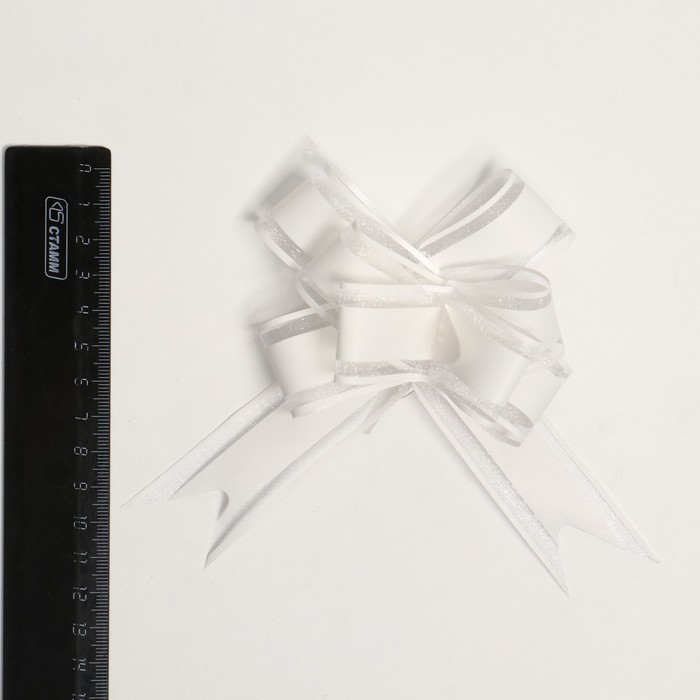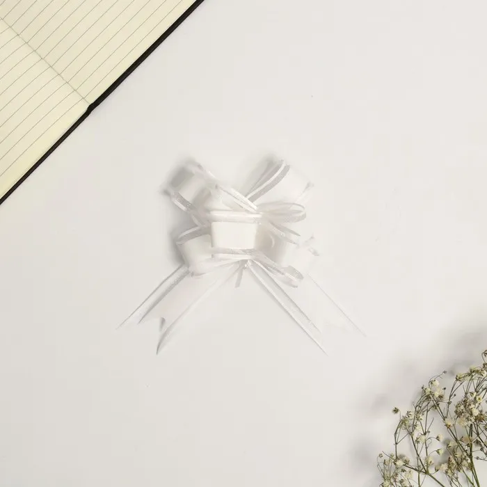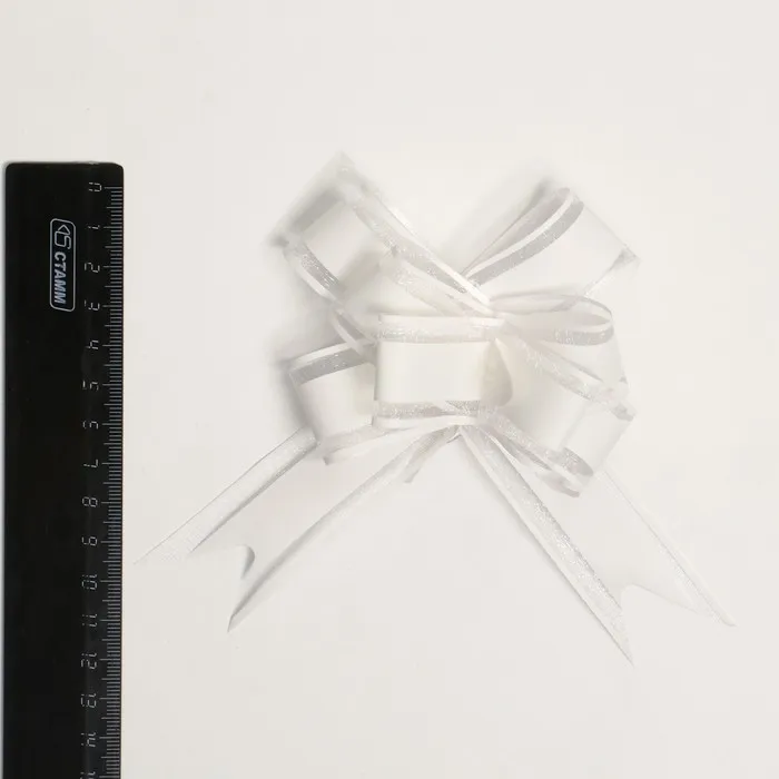 Применение: Для того чтобы собрать бант, надо потянуть за две ленточки, находящиеся между широкими лентами, удерживая широкие ленты в месте спайки.