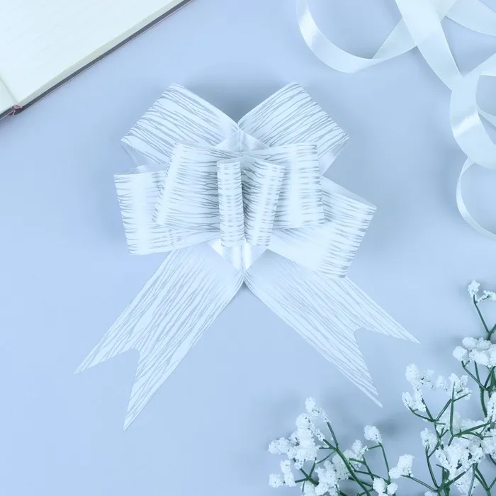Применение: Для того чтобы собрать бант, надо потянуть за две ленточки, находящиеся между широкими лентами, удерживая широкие ленты в месте спайки.