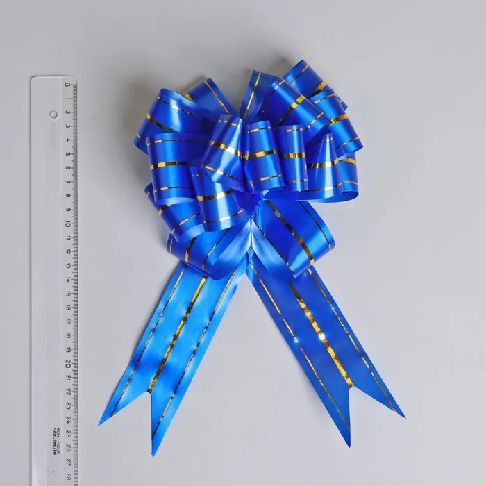 Для того чтобы собрать бант, надо потянуть за две ленточки, находящиеся между широкими лентами, удерживая широкие ленты в месте спайки. Бант собирается за несколько секунд.
