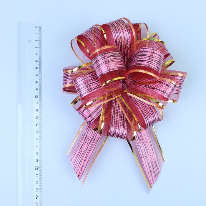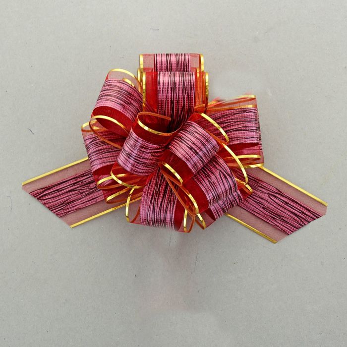 Для того чтобы собрать бант, надо потянуть за две ленточки, находящиеся между широкими лентами, удерживая широкие ленты в месте спайки. Бант собирается за несколько секунд.