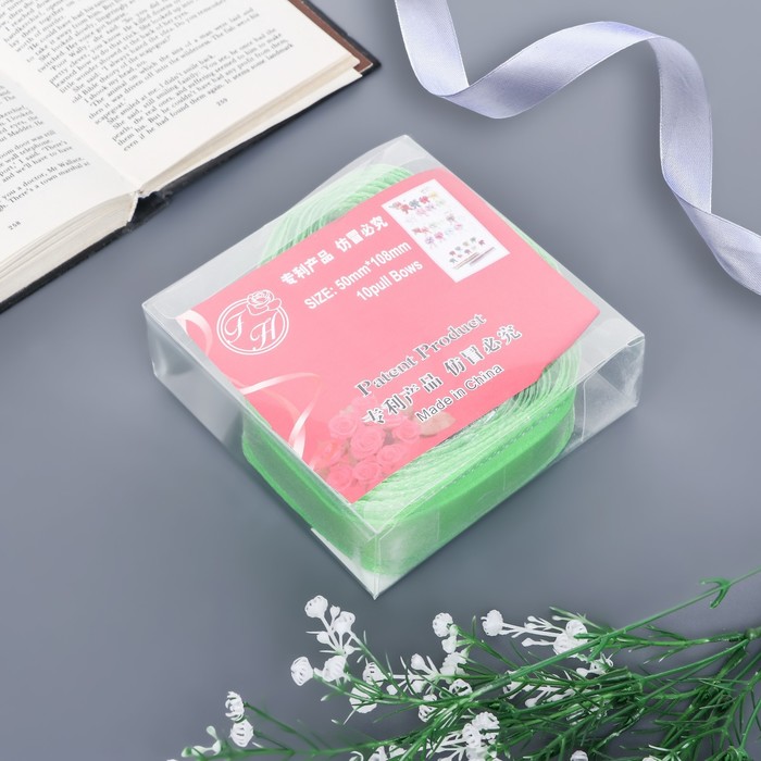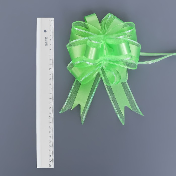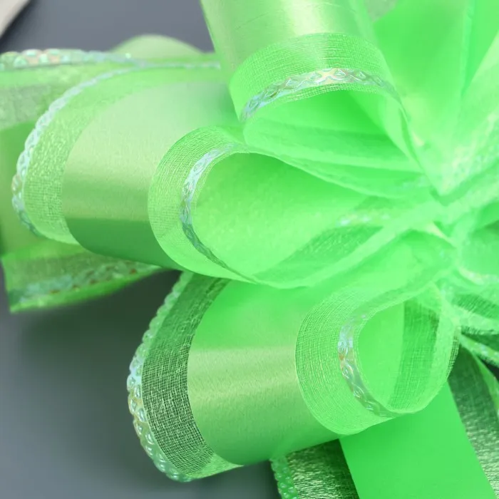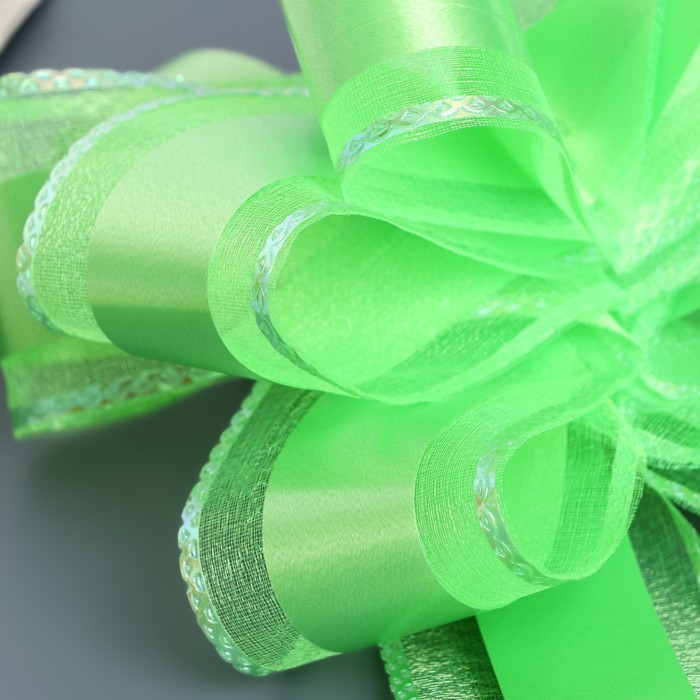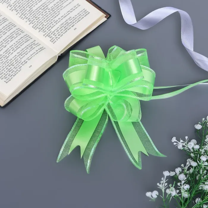 Для того чтобы собрать бант, надо потянуть за две ленточки, находящиеся между широкими лентами, удерживая широкие ленты в месте спайки. Бант собирается за несколько секунд.