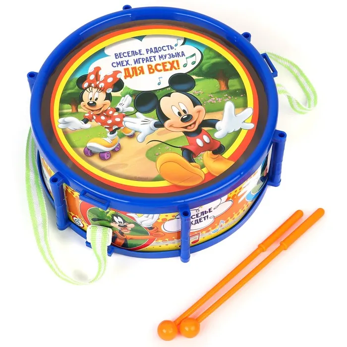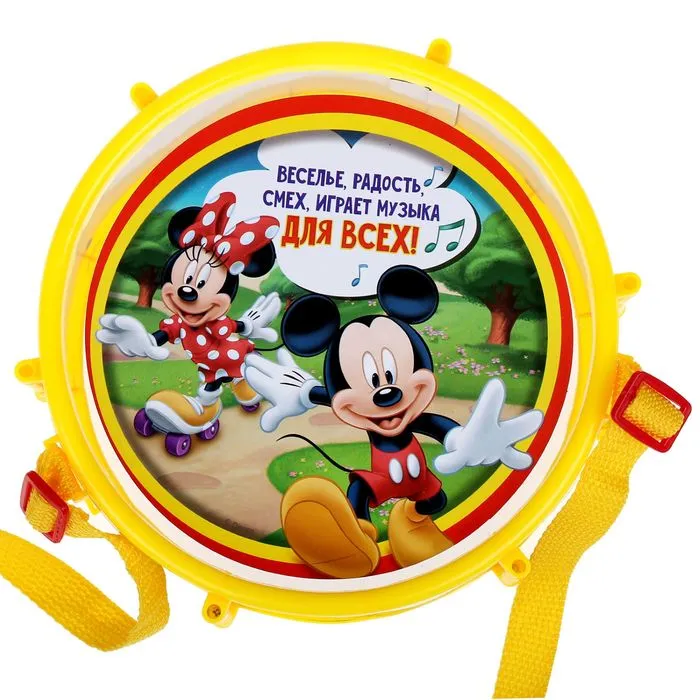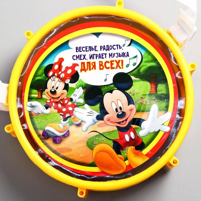 - Красочный дизайн с Микки Маусом и друзьями делает инструмент ещё привлекательнее. Ребёнок будет рад видеть знакомых персонажей на барабане.