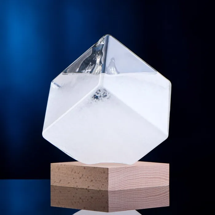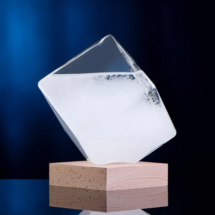 Штормгласс - это химический метеорологический прибор из стеклянной колбы, заполненной спиртовым раствором, в котором в определённых пропорциях растворены камфора, нашатырь и калийная селитра.