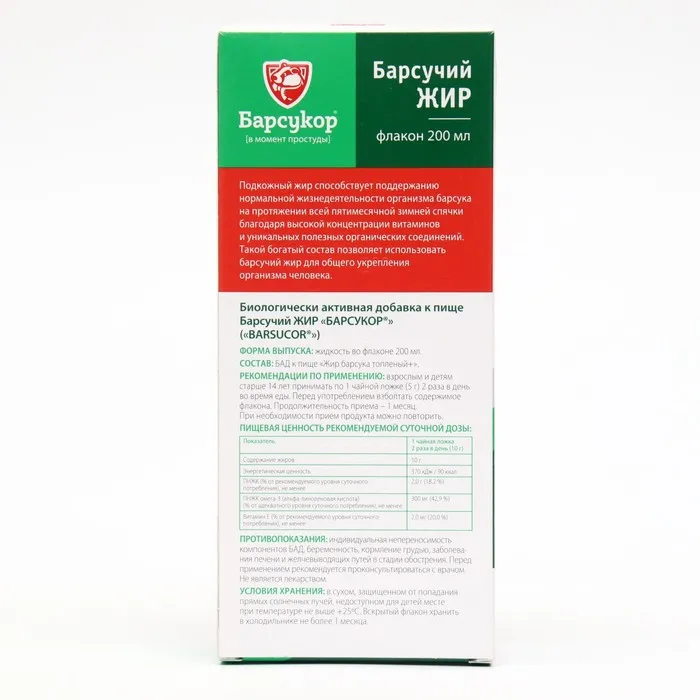 Бренд БАРСУКОР - это серия препаратов на основе барсучьего жира. Бренд уделяет особое внимание безвредности продукции, которая проходит многочисленные проверки на соответствие современным стандартам. В момент простуды и на каждый день.