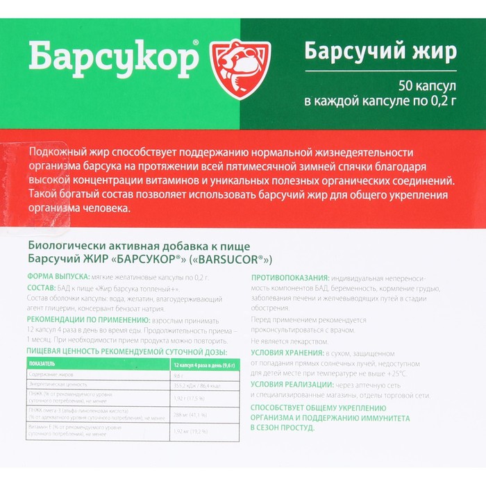 Барсучий жир Барсукор – это проверенное природное средство, показанное при атеросклерозе, заболеваниях легких и дыхательных путей, сниженном иммунитете и нарушенном обмене веществ. Клинические испытания подтвердили высокую эффективность средства при лечении ряда болезней и состояний, связанных с нарушением обмена веществ и повышенным уровнем холестерина.