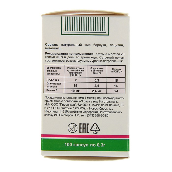 Состав: барсучий жир, лецитин, витамин Е, витамин Д.