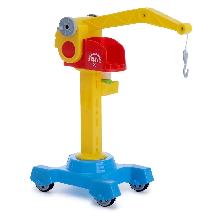 Ребёнок сможет ловко сматывать верёвку-трос с крюком, на котором закрепляется груз, при помощи лебёдки с двумя ручками. Игрушка имеет надёжную устойчивую платформу, оборудованную четырьмя колёсиками, благодаря чему башенный кран легко перемещается в любую точку детской строительной площадки.